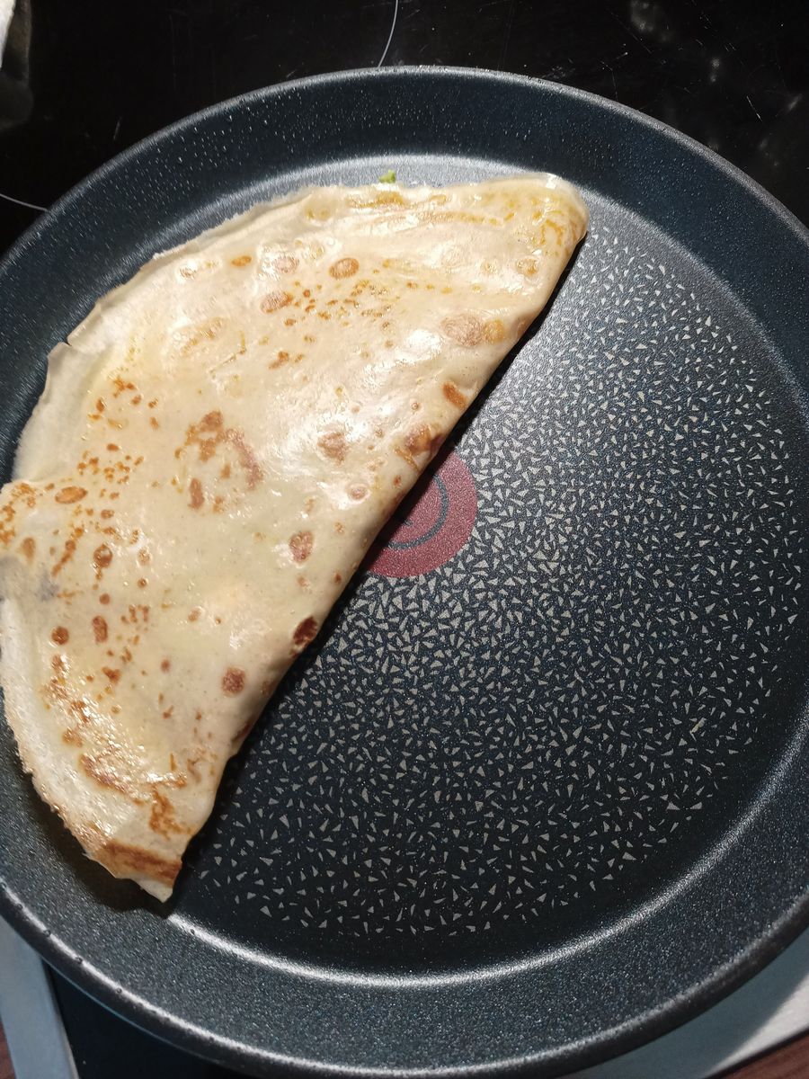 – With a ladle, take some batter and incline the frying pan to allow the batter to spread on the whole surface. Let the crêpe cook to your taste, then return it, to cook the other side. Lower the heat, and put the filling of your choice, on one half of the crêpe.